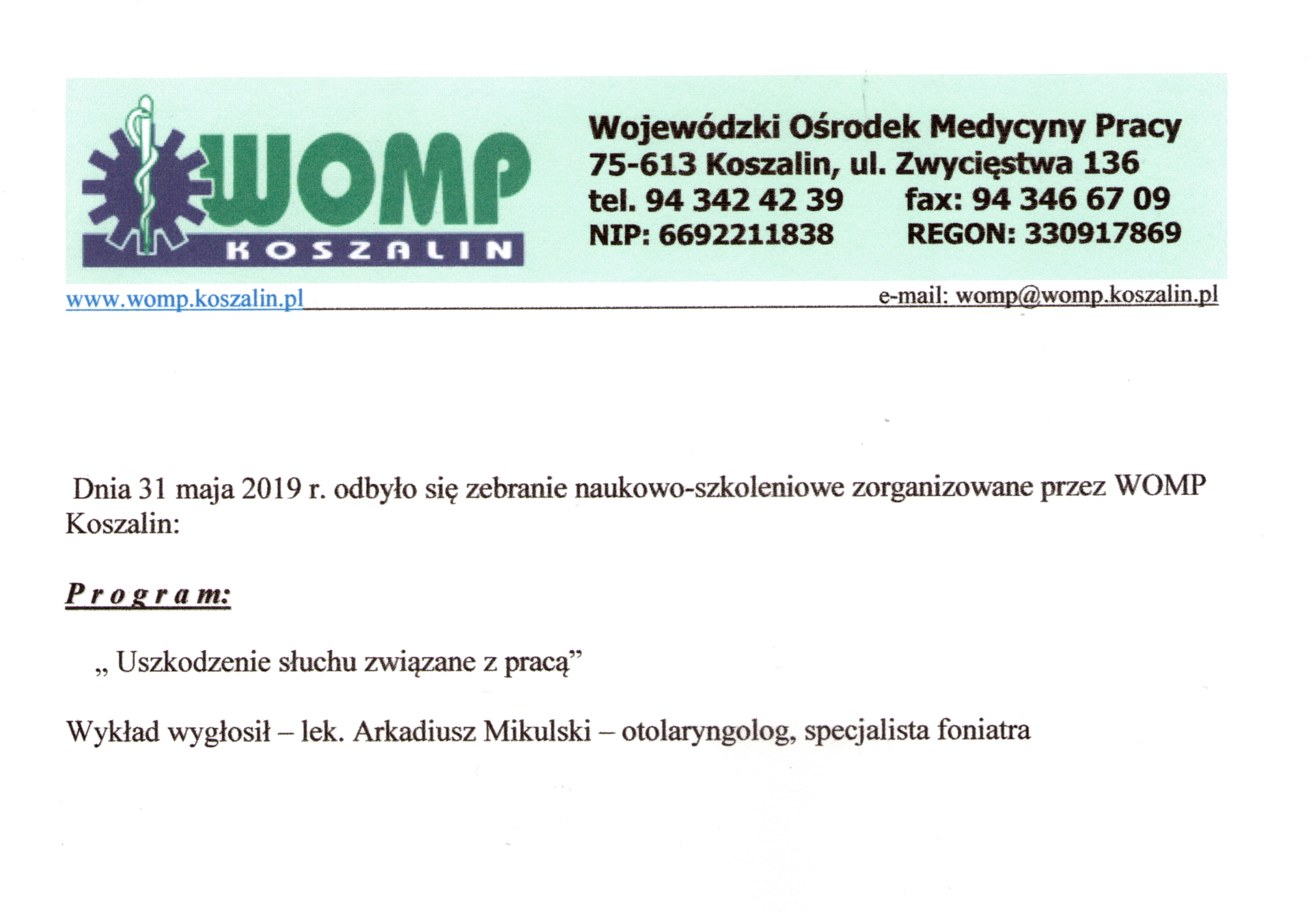 2019-05-31 Odbyte szkolenie "Uszkodzenie słuchu związane z pracą"